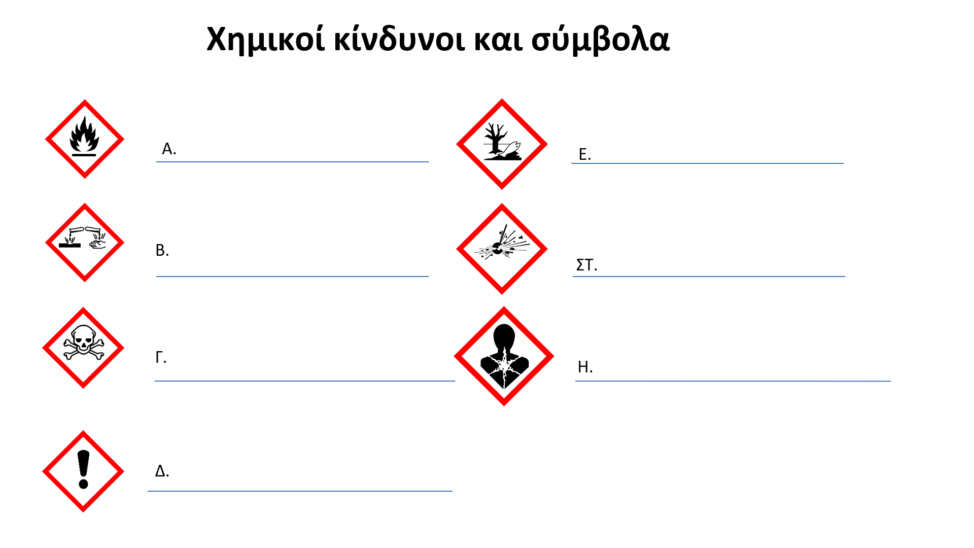 Χημικοί Κίνδυνοι και ΣύμβολαΚαθ. Ιωάννου: Πρέπει επίσης να είμαστε σε θέση να αναγνωρίζουμε τους χημικούς κινδύνους και τα σύμβολά τους. Μοιράζει έναν πίνακα με τα συνηθισμένα σύμβολα κινδύνου και τις σημασίες τους και σας ζητά να αντιστοιχίσετε τα παρακάτω ονόματα κινδύνων με τα χημικά σύμβολα στην παρακάτω εικόνα: 1. Εύφλεκτο 2. Εκρηκτικό 3. Τοξικό/Δηλητηριώδες 4. Ερεθιστικό 5. Διαβρωτικό 6. Περιβαλλοντικό 7. Κίνδυνος για την υγεία Ελέγξτε το βίντεο για τη σωστή απάντηση.