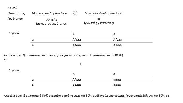 ΜοβΔρ Φόστη: Αυτό είναι σωστό! Βάσει των ευρημάτων σας, το μοβ είναι το επικρατές χαρακτηριστικό γιατί εμφανίζεται στη πλειοψηφία των απογόνων. Παρά το γεγονός ότι ο Mendel είδε όλα τα μοβ άνθη στην πρώτη γενιά (F1), έπρεπε να καταλάβει αν αυτά τα μοβ φυτά ήταν ομόζυγα ή ετερόζυγα. Διάλεξε την σωστή αναπαράσταση του πίνακα Punnett!