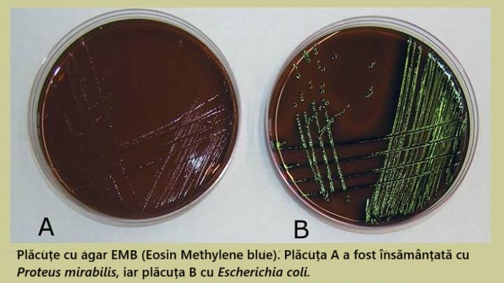 Creștere bacteriană pe mediu EMB: Plăcile A și B prezintă rezultate negative, respectiv pozitive ale testelor. Website: https://www.medical-labs.net/eosin-methylene-blue-agar-emb-833/#google_vignette