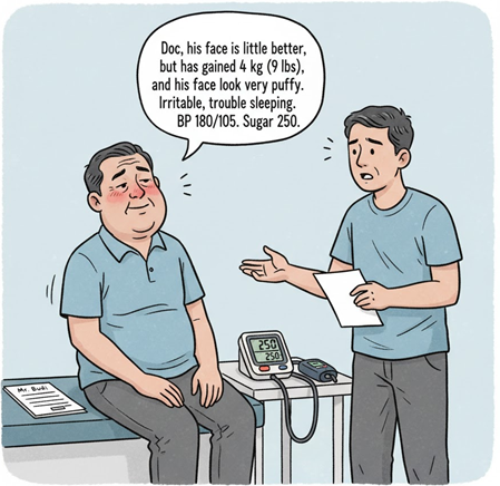 Getting better?You note that Mr. Budi's facial movement has improved partially. However, his son reports several new problems. "Doc, his face is a little better, but he has gained 4 kilograms (about 9 pounds), and his face looks very puffy. He has been very irritable and has trouble sleeping. We checked his blood pressure this morning, and it was 180/105 mmHg. His blood sugar was 250 mg/dL.”
