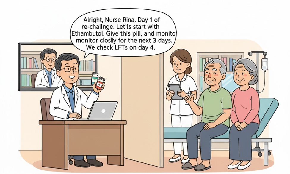 You guide Nurse Rina through a sequential re-challenge via telemedicine: 1 Ethambutol 500 mg is given for 3 days -> LFTs remain normal. 2 Rifampicin 450. mg is added for 3 days -> LFTs remain normal. 3 Isoniazid 300 mg is added for 3 days -> LFTs rise (AST 150, ALT 180). 4 Isoniazid is stopped. LFTs return to normal.