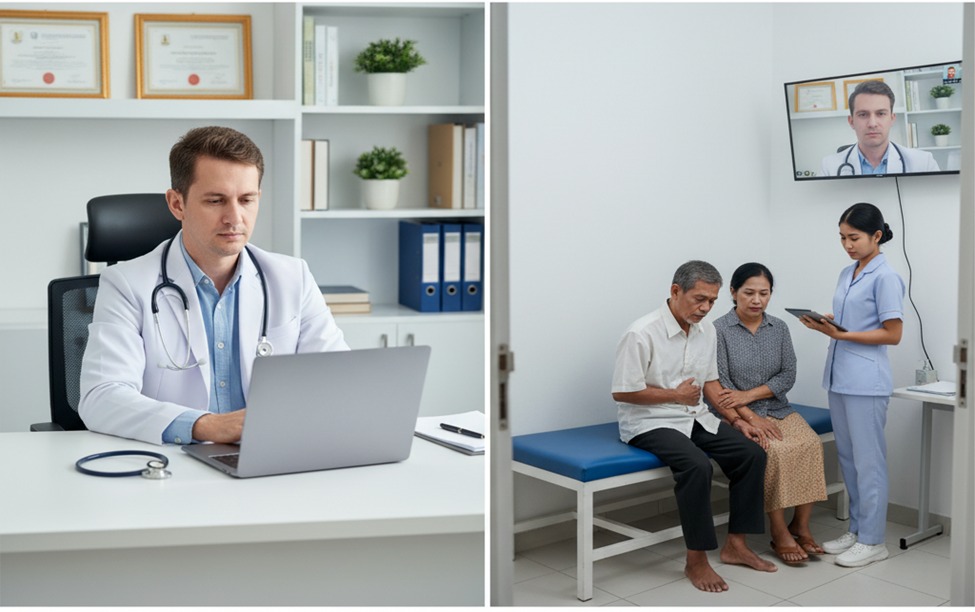You are Dr. Budi, a general practicioner. You are conducting a scheduled teleconsultation from your referral hospital in the city. The patient, Mr. Hartono, a 67-year-old man, is at a satellite clinic in a remote area, accompanied by the clinic nurse, Nurse Rina.